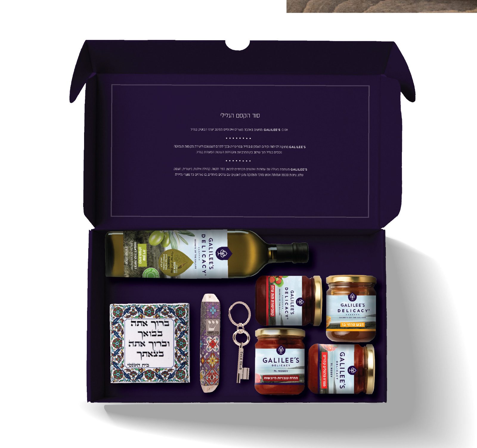 מארז גליליס שנה טובה ומתוקה המכיל: בקבוק שמן זית, צנצנת דבש, צנצנת קונפיטורה, צנצנת ממרח עגבניות, ממרח פלפלים וערכת ברכת הבית של בית השנטי המכילה מזוזה מעוצבת, אריח ברכת הבית, ומחזיק מפתחות ובחרת בחיים